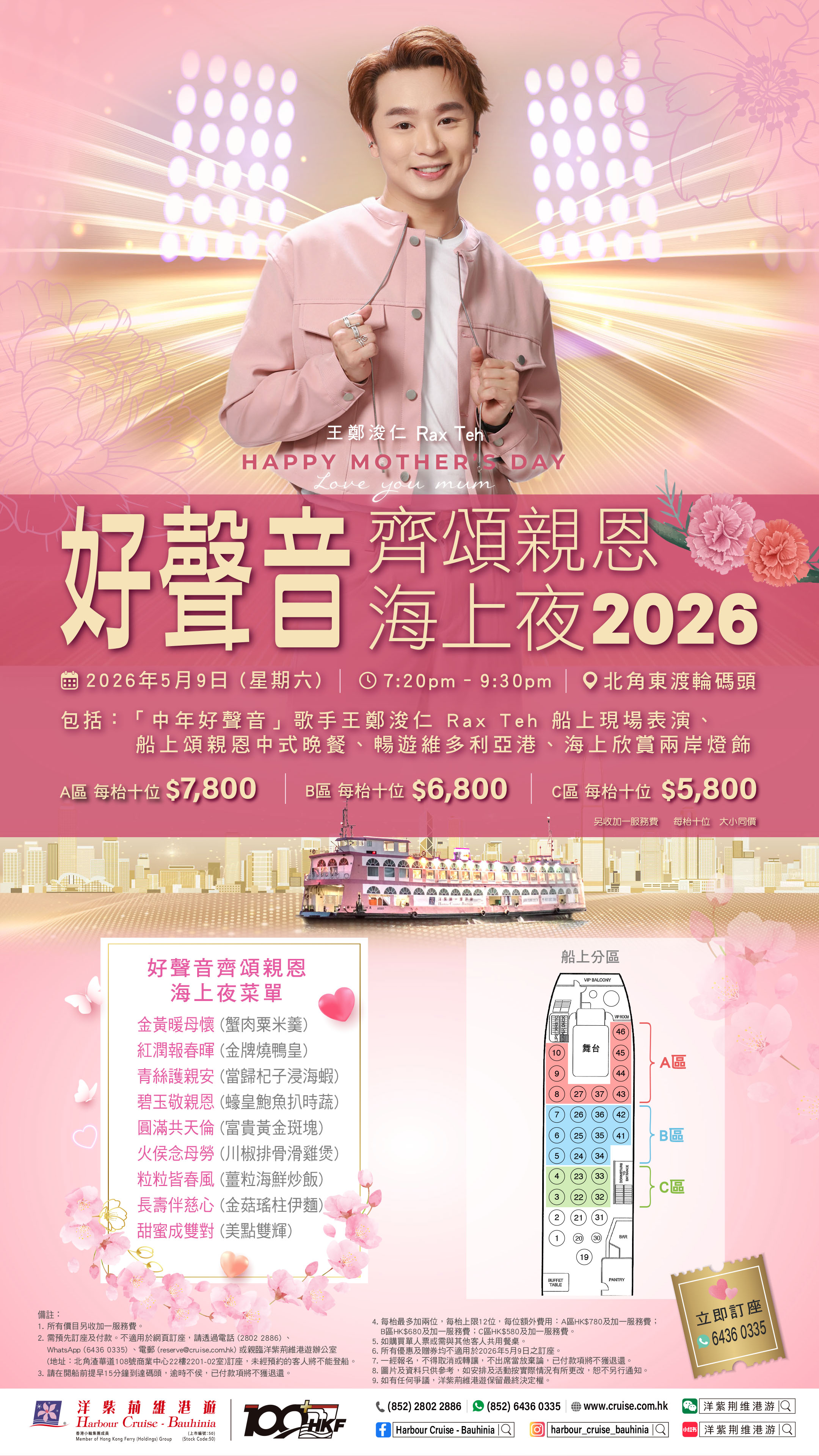 Singer Rax Teh performs live , enjoys a Chinese dinner on board , sail in Victoria Harbour