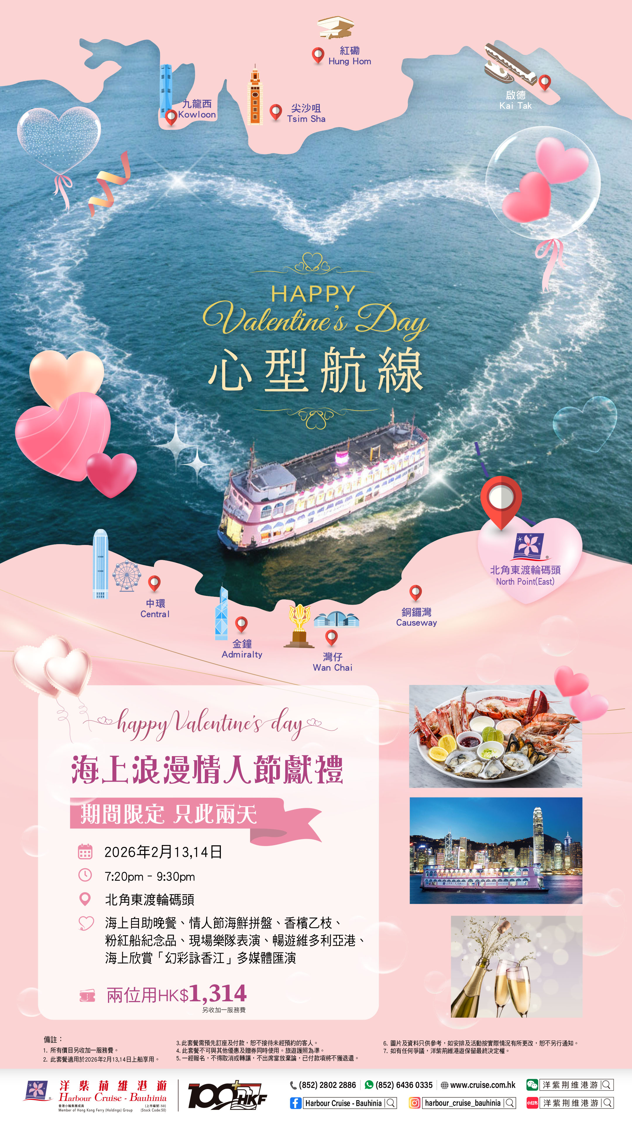 Buffet Dinner Cruise, Valentine's Day Seafood Platter, One Bottle of Champagne, Pink Cruise Souvenir, Live Band Performance, Sightseeing in Victoria Harbour, watch the "A Symphony of Lights" multimedia show
