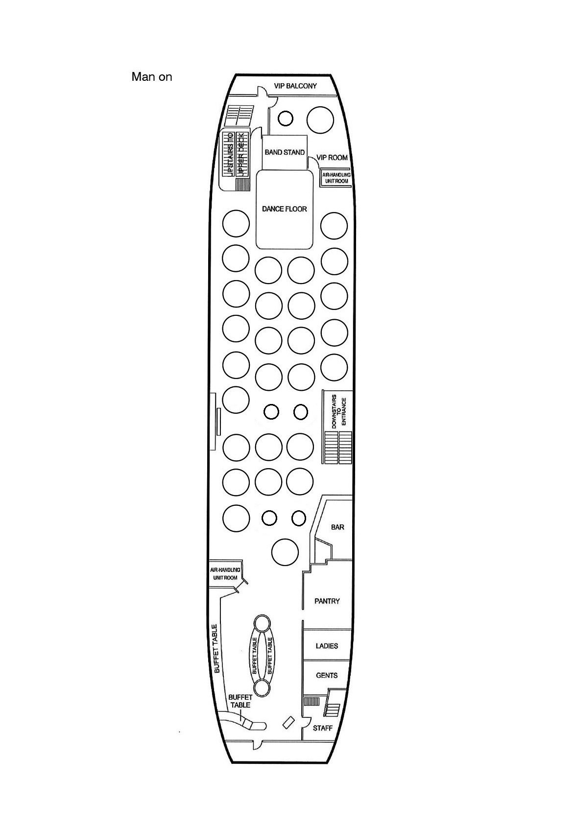34 round tables (32 round tables for 12 persons and 2 round table for 6 persons) and a VIP room for 24 persons in the top deck