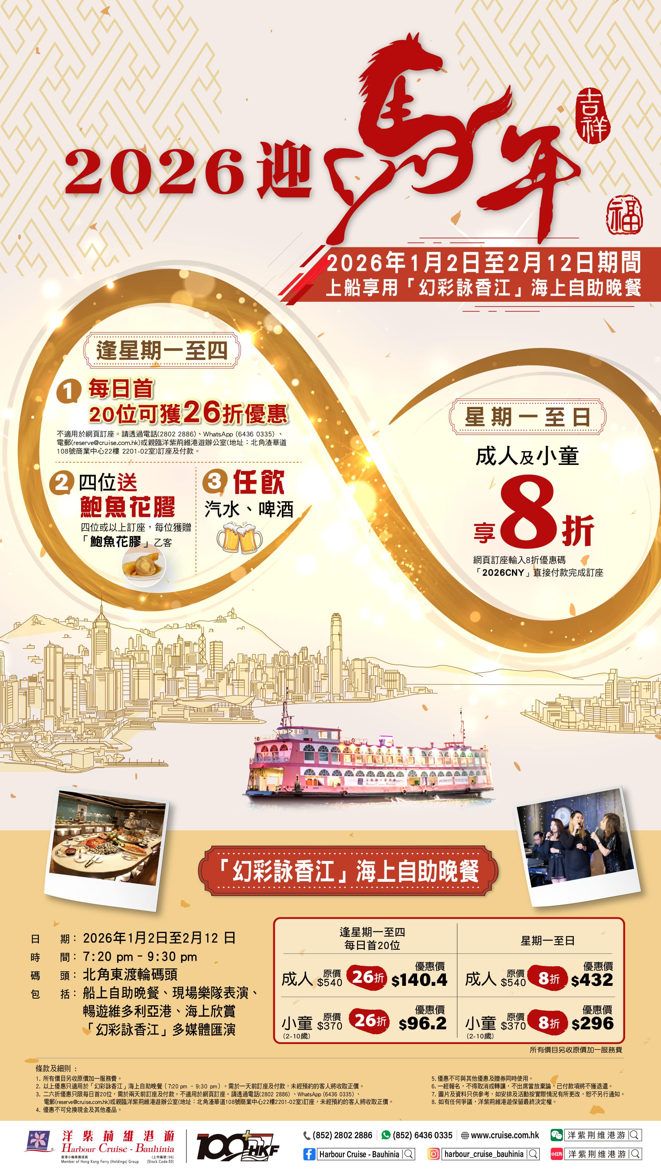 Reservation is not available on website booking (cruise.com.hk), please make reservations via telephone (2802 2886), WhatsApp (6436 0335), email (reserve@cruise.com.hk) or in person at our office (Address: Units 2201- 2, 22/F, Java Road 108 Commercial Centre, North Point, Hong Kong).